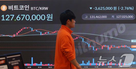 (서울=뉴스1) 김명섭 기자 = 16일 서울 강남구 빗썸 라운지 전광판에 비트코인 시세가 나타나고 있다. 가상자산 대장주 비트코인이 미·일 통화정책 변수에 흔들리며 8만6000달러 선 아래로 내려앉았다. 15일(현지 시각) 코인데스크와 코인마켓캡에 따르면 비트코인은 장중 한때 8만5700달러대까지 하락하며 하루 새 3% 넘는 낙폭을 기록했다. 이는 10월 초 형성된 사상 최고가(12만6000~12만7000달러) 대비 30% 이상 낮은 수준으로, 고점 대비 조정 국면이 본격화됐다는 평가가 나온다. 2025.12.16/뉴스1
