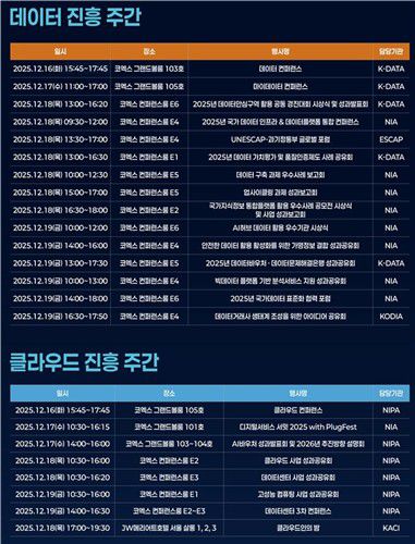 17일부터 19일까지는 ▲ 디지털 서비스 서밋 2025 ▲ 데이터 안심 구역 성과 발표회 ▲ AI 바우처 사업 성과 공유회 ▲ 국가 데이터 인프라·플랫폼 통합 콘퍼런스 등 세부 행사들이 열린다.