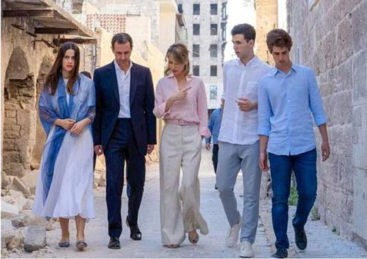바샤르 알 아사드의 가족. 2022년 시리아 알레포에서 촬영된 것으로 왼쪽부터 딸 제인, 아사드, 부인 아스마, 아들 하페즈와 카림. 전 시리아 대통령궁 페이스북 가디언 |
