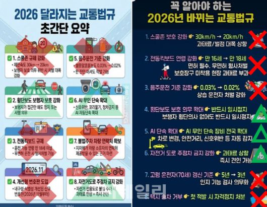 경찰청은 최근 유포되고 있는 ‘2026년 달라지는 교통법규’라는 제목의 이미지에 허위사실이나 과장된 내용이 담겨 있다며 주의할 필요가 있다고 16일 밝혔다. 해당 포스터는 경찰이 도로교통법을 개정한다며 내년부터 8가지 교통법규가 변경될 것처럼 안내하고 있으나 상당수가 사실과 다르다는 설명이다.