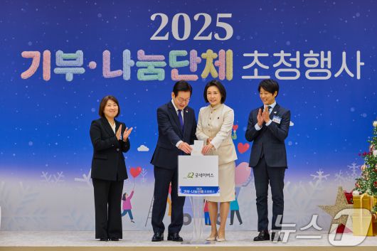(서울=뉴스1) 허경 기자 = 이재명 대통령과 김혜경 여사가 16일 용산 대통령실에서 열린 2025년 기부·나눔단체 초청행사에서 굿네이버스에 성금을 전달하고 있다. 왼쪽부터 전미선 굿네이버스 사무총장, 이 대통령, 김 여사, 최수종 나눔대사. (대통령실 제공. 재판매 및 DB 금지) 2025.12.16/뉴스1