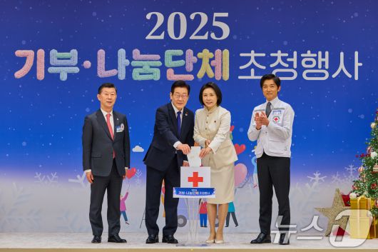 (서울=뉴스1) 허경 기자 = 이재명 대통령과 김혜경 여사가 16일 용산 대통령실에서 열린 2025년 기부·나눔단체 초청행사에서 대한적십자사에 성금을 전달하고 있다. 왼쪽부터 김홍국 대한적십자사 부회장, 이 대통령, 김 여사, 안재욱 홍보대사. (대통령실 제공. 재판매 및 DB 금지) 2025.12.16/뉴스1