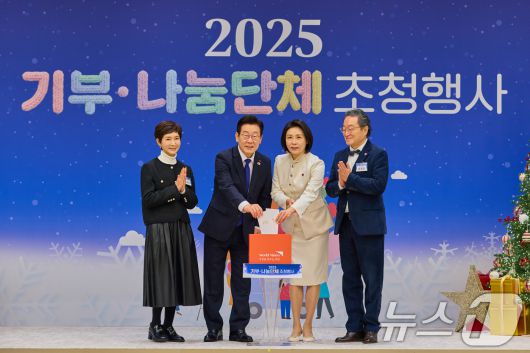 (서울=뉴스1) 허경 기자 = 이재명 대통령과 김혜경 여사가 16일 용산 대통령실에서 열린 2025년 기부·나눔단체 초청행사에서 월드비전에 성금을 전달하고 있다. 왼쪽부터 정애리 친선대사, 이 대통령, 김 여사, 조명환 월드비전 회장. (대통령실 제공. 재판매 및 DB 금지) 2025.12.16/뉴스1