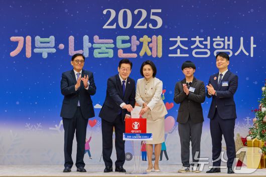 (서울=뉴스1) 허경 기자 = 이재명 대통령과 김혜경 여사가 16일 용산 대통령실에서 열린 2025년 기부·나눔단체 초청행사에서 세이브더칠드런에 성금을 전달하고 있다. 왼쪽부터 정태영 세이브더칠드런 코리아 총장, 이 대통령, 김 여사, 장준희 세이브더칠드런 후원아동, 남궁인 홍보대사. (대통령실 제공. 재판매 및 DB 금지) 2025.12.16/뉴스1