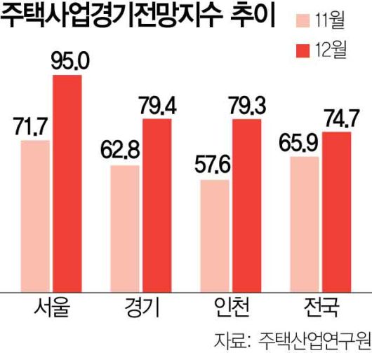 주택산업연구원(주산연)은 주택 사업자를 대상으로 설문 조사를 실시한 결과, 12월 서울 주택사업경기전망지수가 11월보다 23.3포인트 오른 95.0으로 집계됐다고 16일 밝혔다. 이 지수는 기준선인 100을 넘으면 경기를 낙관적으로 내다보는 응답 비율이 높고, 100을 밑돌면 그 반대를 나타낸다.