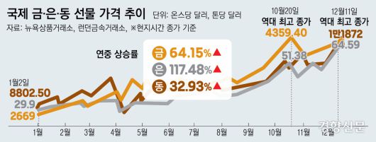 지난 10월을 정점으로 크게 꺾였던 국제 금 가격이 빠르게 회복하면서 역대 최고 종가 경신을 눈앞에 뒀다. 은과 동(구리) 가격도 최근 역대 최고가를 경신하면서 ‘금·은·동’ 가격이 동반 랠리를 이어가고 있다. 미국의 금리인하 기대감이 부각되며 안전자산을 향한 수요가 높은 동시에 은과 동은 인공지능(AI) 등 첨단산업이 크면서 산업적 수요가 폭발했기 때문이다. 당분간 ‘금·은·동’ 랠리가 이어질 것이라는 전망이 우세하지만 향후 미국의 금리인하 기대감이 꺾이면 가격이 떨어질 가능성도 배제할 수 없다.