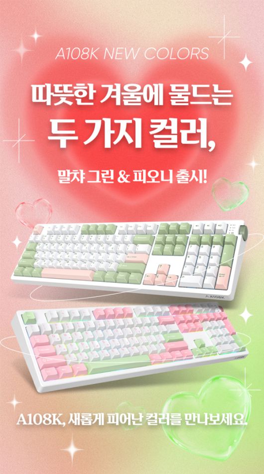 A108K는 기능, 디자인, 편의성을 고루 갖춘 앱코의 스테디셀러 풀배열 키보드로, 이번 컬러 추가를 통해 라인업을 한층 강화했다. 이번에 새롭게 추가된 피오디 컬러는 은은한 핑크 톤의 키캡 조합으로 몽환적이고 감각적인 분위기를 자아내며, 말챠그린은 아이보리 바디에 산뜻한 그린 컬러 키캡을 조합해 편안한 무드를 자아내며 연말 시즌의 따뜻한 분위기와도 잘 어울리는 감성 컬러로 주목받고 있다.