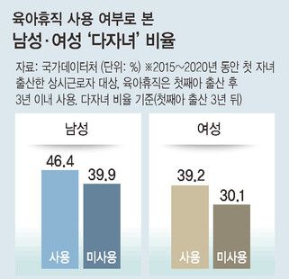 육아휴직의 효과도 확인됐다. 2015~2020년에 첫 자녀를 출산한 상시근로자의 경우, 첫아이 출산 뒤 3년 이내 육아휴직을 사용한 사람이 3년 뒤 또 자녀를 낳은 비율은 남자는 46.4%, 여자는 39.2%였다. 육아휴직을 사용하지 않은 이들의 다자녀 비율은 남자 39.9%, 여자 30.1%에 그쳤다.