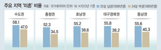 이 나이에 남녀 모두 수도권에 살 경우, 다른 지역보다 미혼·미출산 비율이 가장 높은 것으로 나타났다. 실제 수도권·충청권·호남권·대구경북권·동남권 등 5개 권역 중 1988년생 남성이 32살 때인 2020년 기준 미혼 비율은 수도권이 69.1%로 가장 높고, 나머지 4개 권역은 62~66% 수준으로 낮았다. 미출산 비율도 수도권이 84.5%로 가장 높았고, 비수도권은 77~79%대였다.
