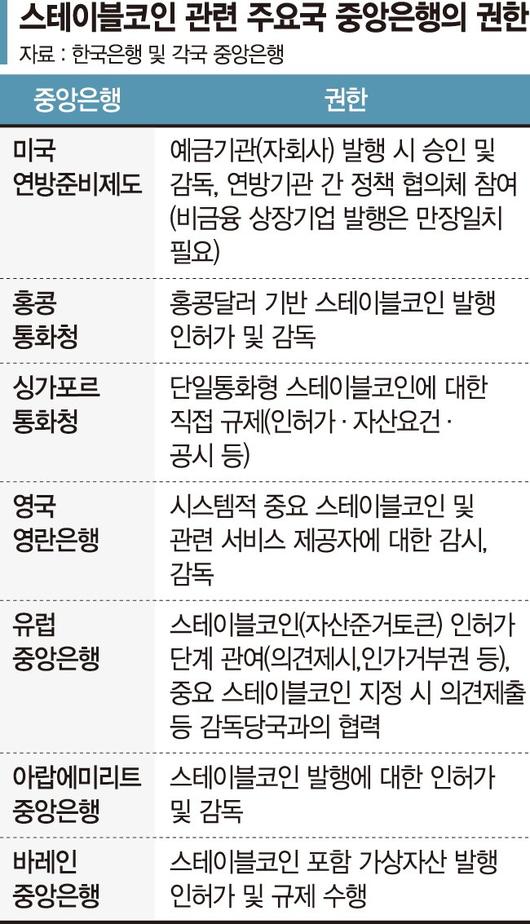 한은은 스테이블코인이 장기적으로 원화의 보완적 수단, 이른바 '준(準)화폐'로 기능할 가능성이 있는 만큼 발행주체에 대한 엄격한 신뢰 기준이 필요하다는 입장이다. 이에 따라 자본·유동성 규제와 감독 체계를 이미 갖춘 은행이 중심이 되는 모델이 적절하다는 의견을 제시하고 있다.