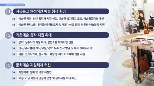 '케이-컬처'의 근간인 문화예술의 지속가능한 성장을 위해 예술인이 안심하고 창작에 전념할 수 있는 창작환경 조성에 대한 지원도 확대한다. 예술인 복지금고를 조성(50억 원, 신규)해 내년에 '시범상품'을 출시할 예정이며, 인공지능(AI)의 빠른 발전으로 급변하는 예술 창·제작 환경 변화에 대응해, 예술인·예술기업을 대상으로 인공지능을 활용한 창‧제작 과정부터 초기 유통·사업화까지 전 주기에 대한 지원 사업을 신설(40억 원, 신규)한다. '미술진흥법' 제정에 따라 공공미술품을 체계적으로 관리․활용하기 위해 국립현대미술관에 설치된 정부미술은행을 '공공미술은행'으로 확대·개편(81억 4천만 원, 71억 6천만 원 증가) 한다.