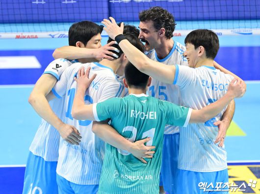 (엑스포츠뉴스 인천, 김한준 기자) 16일 오후 인천 계양체육관에서 열린 '진에어 2025-2026 V-리그' 대한항공과 현대캐피탈의 경기, 대한항공 선수들이 득점 후 기뻐하고 있다.김한준 기자 kowel@xportsnews.com