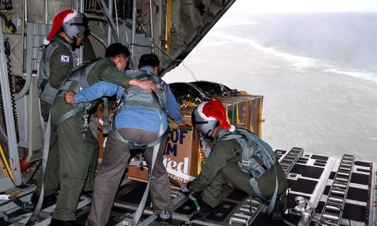 참 미국 태평양 공군사령부가 주관하는 ‘크리스마스 공수작전’에서 참여한 한국 공군 장병과 아렌 팔릭 미크로네시아 부통령(왼쪽 세번째)이 지난 12일 우리 C-130H 수송기에서 구호물자를 담은 번들을 투하하고 있다. 지난 7∼14일 진행된 크리스마스 공수작전은 남태평양 괌 남쪽 미크로네시아 지역 10여개 섬에 의약품과 의류, 생활필수품 등 구호물자를 낙하산에 매달아 약 60m 고도에서 투하하는 방식으로 전달하는 작전이다. 우리 공군은 제5공중기동비행단 소속 C-130 수송기 1대와 조종사, 정비사, 지원 요원 등 30여명을 파견해 작전에 참여했다.
