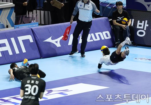 [인천=스포츠투데이 권광일 기자] 2025-2026 진에어 V-리그 남자부 대한항공-현대캐피탈 경기가 16일 인천 계양체육관에서 열렸다. 현대캐피탈 박경민이 수비를 하고 있다. 2025.12.16. [스포츠투데이 권광일 기자 sports@stoo.com]