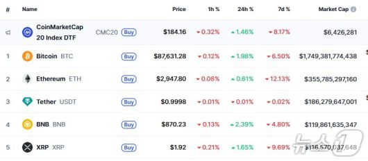 이 시각 현재 주요 암호화폐 시황 - 코인마켓캡 갈무리 |