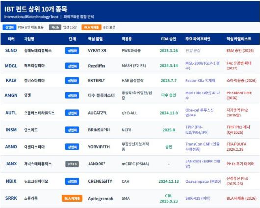 IBT의 상위 10개 투자 종목은 ①솔레노테라퓨틱스(SLNO) ②매드리갈파마슈티컬스(MDGL) ③칼비스타파마슈티컬스(KALV) ④암젠(AMGN) ⑤오토러스테라퓨틱스(AUTL) ⑥인스메드(INSM) ⑦아센디스파마(ASND) ⑧재넉스테라퓨틱스(JANX) ⑨뉴로크린바이오사이언스(NBIX) ⑩스콜라록(SRRK)다. 모두 미국 거래소에 상장돼 있고 ①~⑦까지는 미국 기업, ⑧⑨⑩은 본사가 외국(각 영국, 영국, 덴마크)에 있다. ADR로 상장돼 있다.