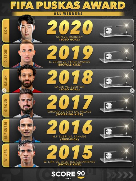 축구 매체 '스코어90'은 2009년부터 2025년까지 푸스카스 수상자를 돌아보았다. 2024년에는 맨체스터 유나이티드에서 뛰던 알레한드로 가르나초가 웨인 루니를 연상케하는 바이시클 킥으로 상을 받았고, 2021년에는 손흥민의 동료로 알려진 에릭 라멜라가 아스널전에서 터뜨린 라보나킥 득점으로 수상했다.
