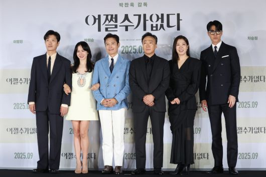 19일 서울 용산구 CGV 용산아이파크몰에서 열린 영화 ‘어쩔수가없다’ 제작보고회에서 배우들이 포즈를 취하고 있다. 왼쪽부터 박희순, 손예진, 이병헌, 이성민, 염혜란, 차승원. [연합] |