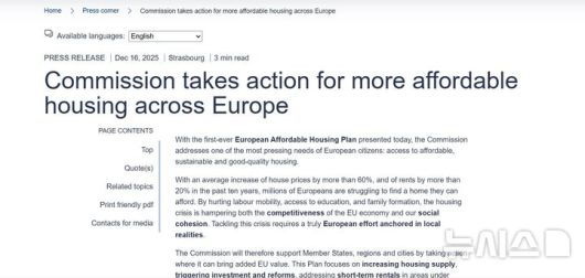 [서울=뉴시스] 유럽연합(EU) 집행위원회가 16일(현지시간) 전 회원국에서 심화되는 주거난을 해결하기 위해 범EU 차원의 첫 '부동산 대책(Affordable Housing Plan)'을 발표했다. 사진은 EU 홈페이지엑 게재된 보도자료. 2025.12.17 photo@newsis.com |