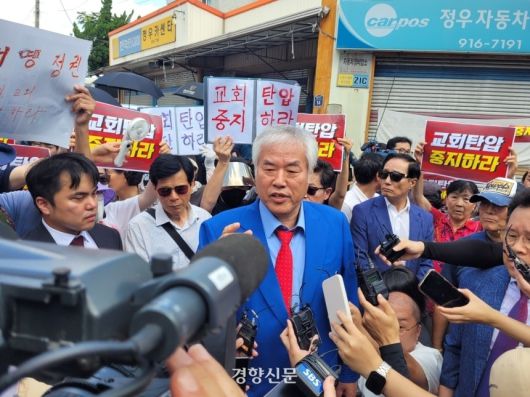 서울서부지법 난입·폭력 사태를 선동·지시한 혐의를 받는 전광훈 사랑제일교회 목사가 경찰의 압수수색이 진행된 지난 8월5일 서울 성북구 사랑제일교회 앞에서 기자들과 만나 질문에 답하고 있다. 백민정 기자 |