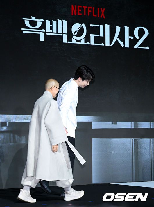 셰프 손종원이 선재스님의 손을 잡고 자리로 이동하고 있다. 2025.12.17 /cej@osen.co.kr