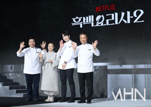 (MHN 이지숙 기자) 정호영, 선재스님, 손종원, 후덕죽이 17일 오전 서울 종로구 JW메리어트동대문스퀘어에서 열린 넷플릭스 예능 '흑백요리사: 요리 계급 전쟁2'(이하 '흑백요리사2') 제작발표회에 참석해 포즈를 취하고 있다.