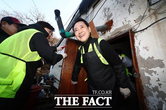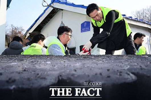 [더팩트ㅣ고양=남윤호 기자] 장동혁 국민의힘 대표가 17일 경기 고양시 화전마을에서 '청년과 함께 따뜻한 겨울나기' 연탄 배달 봉사활동에 나서고 있다.