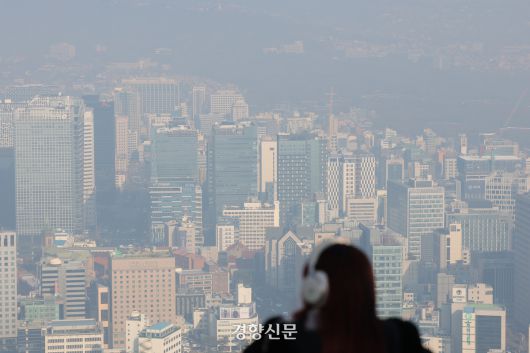 서울 중구 남산공원에서 본 하늘이 미세먼지로 뿌옇다. 정효진 기자 |