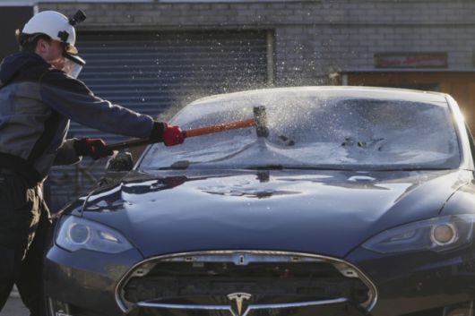 지난 4월10일(현지시간) 영국 런던에서 한 시위 참가자가 테슬라 자동차를 부수고 있다. 이 시위는 일론 머스크 미 테슬라 최고경영자(CEO)에 반대하는 ‘모두가 일론을 증오해' 단체가 주최했다. /런던(영국) AP=뉴시스 |