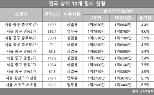 공시지가 상위 10위권의 순위는 지난해와 동일했으며 이 가운데 1~8위는 모두 중구 명동 일대에 집중됐다. 9위는 강남구 역삼동 일원에 위치한 업무용 부지(747.7㎡)가, 10위는 서초구 서초동에 위치한 면적 662.2㎡ 업무용 부지가 차지했다.