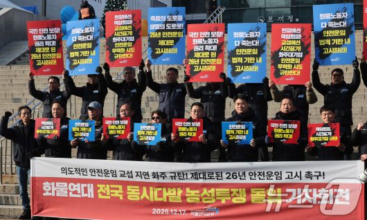 (서울=뉴스1) 박지혜 기자 = 민주노총 공공운수노조 화물연대본부 조합원들이 17일 서울 중구 서울역 광장에서 열린 전국 동시다발 농성투쟁 돌입 기자회견에서 의도적으로 안전운임 교섭을 지연시키는 화주단체를 규탄하고, 제대로 된 2026년 안전운임 고시를 촉구하고 있다. 2025.12.17/뉴스1