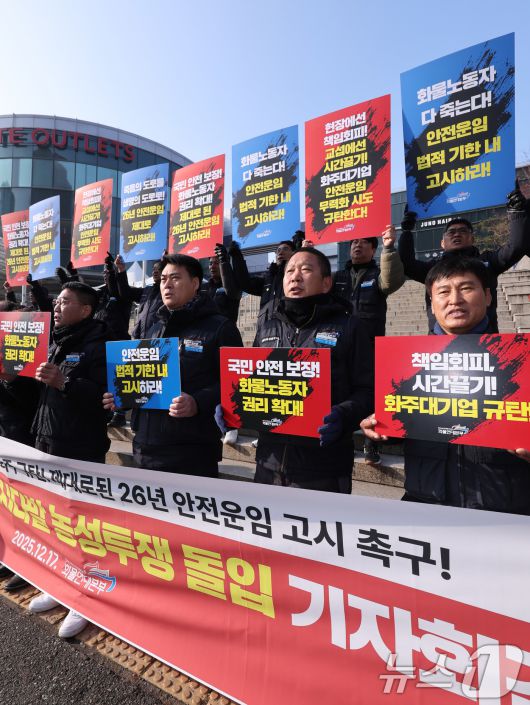 (서울=뉴스1) 박지혜 기자 = 민주노총 공공운수노조 화물연대본부 조합원들이 17일 서울 중구 서울역 광장에서 열린 전국 동시다발 농성투쟁 돌입 기자회견에서 의도적으로 안전운임 교섭을 지연시키는 화주단체를 규탄하고, 제대로 된 2026년 안전운임 고시를 촉구하고 있다. 2025.12.17/뉴스1