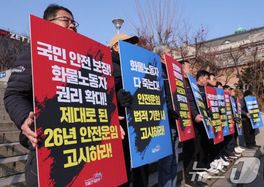 (서울=뉴스1) 박지혜 기자 = 민주노총 공공운수노조 화물연대본부 조합원들이 17일 서울 중구 서울역 광장에서 열린 전국 동시다발 농성투쟁 돌입 기자회견에서 의도적으로 안전운임 교섭을 지연시키는 화주단체를 규탄하고, 제대로 된 2026년 안전운임 고시를 촉구하고 있다. 2025.12.17/뉴스1