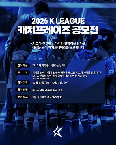 (서울=연합뉴스) 오명언 기자 = 한국프로축구연맹이 2026시즌 K리그 공식 캐치프레이즈를 선정하기 위한 팬 참여 공모전을 개최한다고 17일 밝혔다.