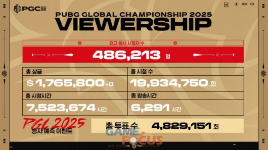 올해 PGC 2025 그랜드 파이널은 다양한 글로벌 지표에서 의미있는 성과를 달성했다. 총 시청 수는 1,993만 4,750회를 기록했으며, 최고 동시 시청자 수는 48만 6,213명에 달했다. 총 시청 시간은 약 752만 3,674시간, 총 방송 시간은 6,291시간을 기록했다. 또한 승자 예측 이벤트에는 총 482만 9,151건의 투표가 진행되며 글로벌 팬덤의 높은 참여 열기를 입증했다.