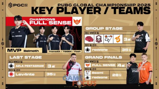 경기 결과, 올해 PGC 2025 우승은 태국의 풀센스(FULL SENSE)가 차지했다. 풀센스는 그랜드 파이널 초반부터 강력한 전투력과 안정적인 운영을 바탕으로 우승권을 빠르게 형성했으며, 경기 내내 꾸준한 기세를 이어가 최종 누적 포인트에서 큰 격차를 벌리며 정상에 올랐다.