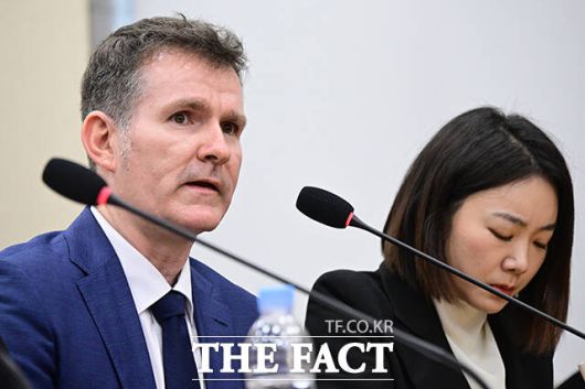 [더팩트ㅣ국회=남윤호 기자] 민병기 쿠팡 대외협력 총괄 부사장과 김명규 쿠팡이츠 대표가 17일 오후 서울 여의도 국회 과학기술정보방송통신위원회에서 열린 쿠팡 침해사고 관련 청문회에 출석해 굳은 표정을 짓고 있다. 가운데는 해롤드 로저스 쿠팡 대표이사.