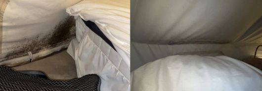 침대 머리맡에 닿아 있는 텐트 천장에 곰팡이가 가득 피어 있던 것입니다.