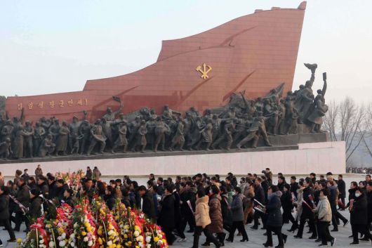 [평양=AP/뉴시스] 17일 북한 평양 만수대 언덕에서 김정일 국방위원장 14주기를 맞아 평양 시민들과 군인들이 김일성 주석과 김정일 국방위원장 동상에 참배하고 있다. 2025.12.17.