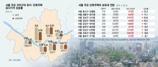 내년 서울 용산·성동구 등 주요 자치구의 단독주택 공시가격이 크게 오르면서 보유세 부담이 10% 안팎으로 늘어날 것으로 전망된다. 정부의 공시가 현실화율 제고와 공정시장가액비율 상향 조치가 없어도 서울 강남 3구와 ‘한강벨트’ 일대 주택의 보유세가 수십만 원에서 수백만 원까지 증가할 것으로 예상된다. 서울 표준지 공시가격 역시 내년에 5% 가까이 상승하면서 종합부동산세 부담이 대폭 커질 것으로 평가된다.