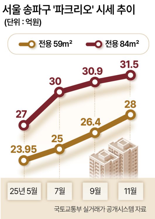 실거래가에서도 신고가 흐름이 확인된다. 국토교통부 실거래가 공개시스템에 따르면 거래량 1위 단지인 파크리오는 11월에도 신고가 거래가 이어졌다. 지난달 17일 59㎡(이하 전용면적)가 28억원(6층)에 거래됐고, 같은 날 84㎡는 31억5000만원(16층)에 손바뀜했다.
