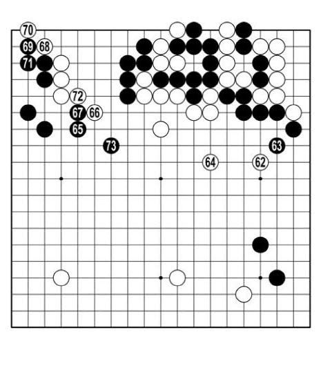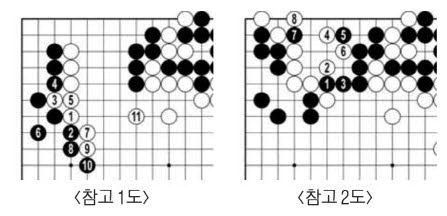 백62와 64. 이쪽이 아니었다. 흑65가 급소였다. <참고 1도> 백1을 먼저 둘 때였다. 흑73이 좋은 수. <참고 2도> 흑1로 끊으면 백8로 패를 만들어 버틴다. 이건 백이 할 만한 싸움이다.