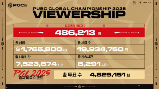 크래프톤이 이날 공개한 인포그래픽에 따르면 최고 동시 시청자 수는 48만 6213명이다. 총 시청 시간은 약 752만 3674시간, 총 방송 시간은 6291시간을 기록했다. 또한 승자 예측 이벤트에는 총 482만 9151건의 투표가 진행되며 글로벌 팬덤의 높은 참여 열기를 입증했다.