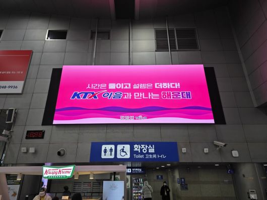 서울 청량리역 청사 안 게시판에 케이티엑스-이음 열차 정차역에 선정된 해운대구(신해운대역·센텀역)를 알리는 영상이 나오고 있다. 해운대구 제공 |