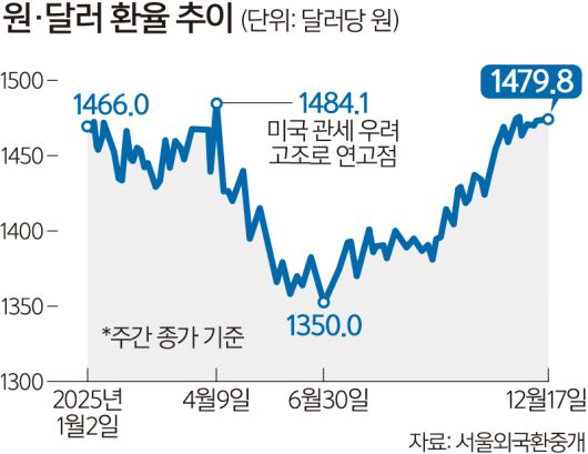 원·달러 환율이 17일 장중 1480원대를 돌파하며 미·중 관세전쟁 우려가 최고조에 달했던 지난 4월 수준에 근접했다. 외환당국은 국민연금과 맺은 외환스와프를 가동해 진화에 나섰지만, 상승세를 꺾지 못했다. 환율이 현재 수준을 유지하면 내년 물가상승률은 한국은행 목표치를 뛰어넘는 2% 중반까지 오를 전망이다.