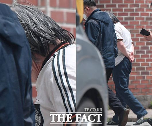 조두순이 2021년 5월 7일 오전 경기도 안산시 단원구 자택 인근에서 전담 보호관찰관과 함께 이동하고 있다. /더팩트 DB |