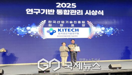 (영주=국제뉴스) 백성호 기자 = 한국생산기술연구원(원장 이상목) 산하 영주 하이테크베어링기술센터(센터장 김종형)는 지난 16일 서울드래곤시티호텔 컨벤션타워에서 열린 '2025년 연구기반협의체' 행사에서 '2025년 연구기반 통합관리 포상' 한국산업기술진흥원(KIAT) 원장 표창을 수상했다.