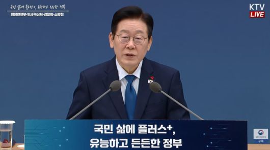[서울=뉴스핌] 박찬제 기자 = 이재명 대통령이 17일 세종시 정부세종컨벤션센터에서 행정안전부·경찰청·소방청·인사혁신처 업무보고를 주재하고 있다. [사진=KTV] 2025.12.17 pcjay@newspim.com |