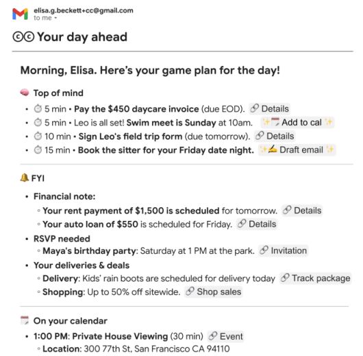 CC는 '제미나이'를 활용하며, 사용자의 지메일, 구글 드라이브, 구글 캘린더와 연동해 매일 아침 이메일 형태의 개인화된 요약 브리핑을 제공한다.