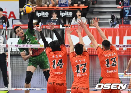 [OSEN=부산, 이석우 기자] 17일 부산 강서실내체육관에서 진에어 2025-2026 V리그 남자부 OK저축은행과 우리카드의 경기가 열렸다. 두 팀은 이번 시즌 만났다 하면 5세트 접전을 벌이고 있다. 이번 경기에서도 5세트 접전이 벌어질지 주목된다. 우리카드 아라우조가 OK저축은행 블로킹을 뚫고 스파이크를 날리고 있다. 2025.12.17 / foto0307@osen.co.kr